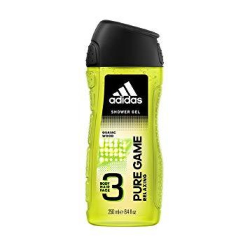 Adidas Гель для душу чоловічий 3в1 Pure Game 250мл. Для тіла, волосся і обличчя. З екстрактом Гваяки і деревинним ароматом.Унікальна формула 3в1 зволожує Ваше тіло, делікатно доглядає за обличчям і очищає волосся. Для щоденного використання. PH-нейтральний. Дерматологічно протестовано.