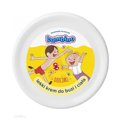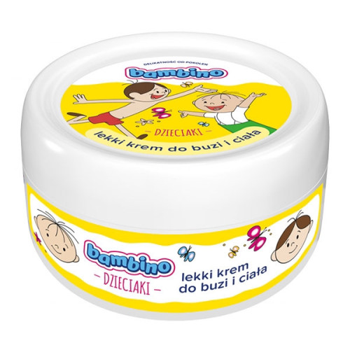 Bambino Легкий дитячий крем для обличчя і тіла 250мл. Цей крем призначений для щоденного догляду за делікатною дитячою шкірою обличчя і тіла. Завдяки формулі з вмістом пантенолу, крем заспокоює шкіру, інтенсивно зволожує і захищає її від пересушення. Використання: невелику кількість крему нанесіть на шкіру обличчя і тіла малюка. Уникайте контакту з очима!
