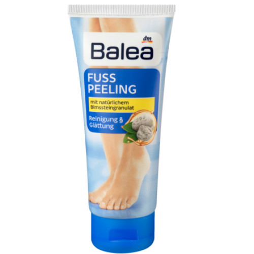 Balea Крем-пілінг для ніг 100мл. Завдяки вмісту натуральних гранул пемзи, крем ніжно видаляє залишки омертвілої шкіри, пом’якшує шкіру ніг і покращує її еластичність. Вміст у рецептурі комплексу з оії жожоба. Екстракту кінського каштану, сечовини і вітаміну Е забезпечує інтенсивне зволоження шкіри ніг. Дерматологічно протестовано. Використання:-втирати круговими рухами у зволожену шкіру і після цього змити водою. Увага: Не використовувати дітям до 14 років! Уникати контакту з очами! Не використовувати крем більше ніж один раз в тиждень! Не використовувати на подразненній і пошкодженій шкірі!