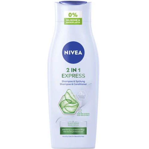 Шампунь та кондиціонер Nivea 2в1 Express делікатно очищає та інтенсивно доглядає за Вашим волоссям за лічені хвилини. Спеціально розроблена рецептура 2в1 поєднує високоефективну сироватку для блиску та натуральний екстракт Алое Вера для покращеного розчісування та гладкості а також захищає від ламкості та зміцнює структуру волосся для більшої стійкості, не обтяжуючи його. Ідеально підходить для тих, хто цінує швидкий та простий догляд без шкоди для волосся.