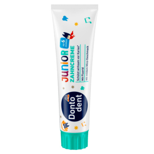 Dontodent Junior 6+ Дитяча м'яка зубна паста для постійних зубів 75мл. Паста спеціально розроблена для оптимального захисту від карієсу під час переходу на постійні зуби, а також для самих постійних зубів. Солі фтороводневої кислоти зміцнюють чутливу зубну емаль і роблять зуби стійкішими до карієсу і протидіють руйнуванню зубної емалі.