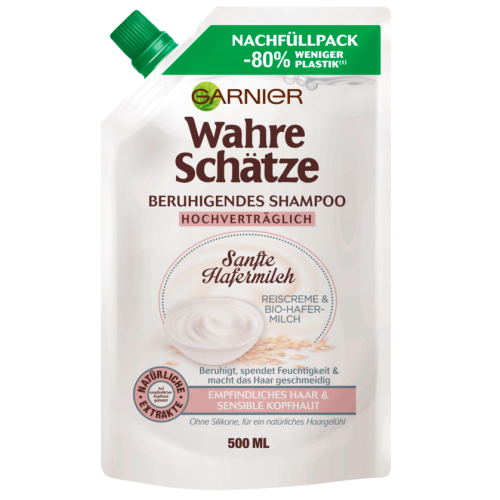 Garnier Wahre Schatze Заспокійливий шампунь для делікатного волосся та чутливої шкіри голови Sanfte Hafermilch Рисовий крем-Вівсяне молочко дой-пак 500 мл.