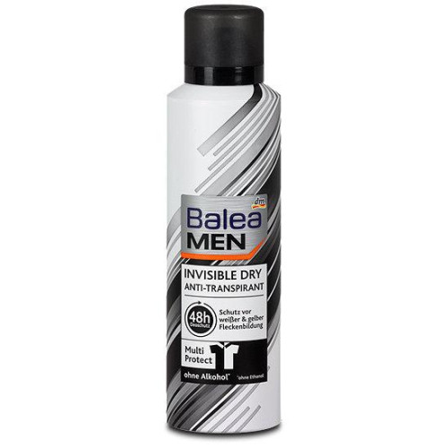 Balea Men Дезодорант спрей Invisible 200мл. Забезпечує надійний захист від поту (48годин) і не подразнює шкіру! Не залишає ніяких слідів на темному одязі і мінімізує утворення жовтих плям на світлому одязі. Сумістний із шкірою, придатний для чутливої шкіри. Дерматологічно протестовано.