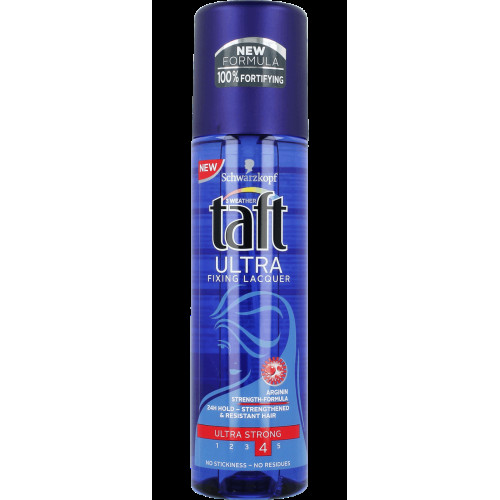 Taft Ultra Strong Рідкий лак для волосся 200мл. Формула з вмістом Аргініну зміцнює волосся і робить його стійким до впливу зовнішніх чинників. Лак забезпечує 24 годинну фіксацію волосся без злипання, не обтяжує його і не залишає ніяких слідів. Також лак захищає волосся від пересушення і від шкідливого впливу ультра-фіолетового випромінювання. Лак можна використовувати в якості рідини для вкладання (для вологого волосся).