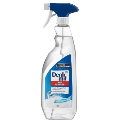 Denkmit Миючий засіб для ванної кімнати з ароматом лимону 1л. Містить антивапнякові компоненти і має складники на мильній основі. Очищає ванну,душову кабіну, вмивальники, керамічну плитку та сантехніку. Ідеально підхо-дить для поверхонь з пластмаси та акрилу. Використання: -повернути ковпачок у положення ON, розпилити засіб і залишити на 3-5хв. а потім змити водою. При сильних вап-някових відкладеннях збільшують годину впливу.Увага: не використовувати на мармурі, на матеріалах, які містять вапно та на інших чутливих матеріалах. При використанні на керамічній плитці попередньо змочити водою міжплиточні шві.